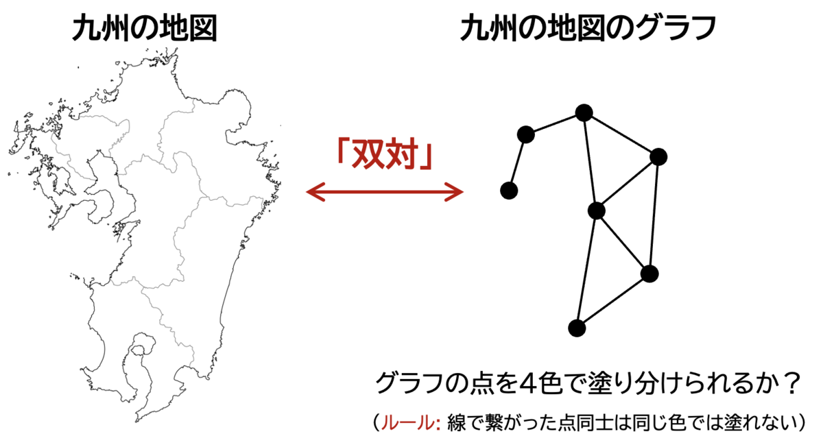 左側が地図上の形を表していて、右側がその地図のグラフを表しています。これらは双対の関係にあります。
