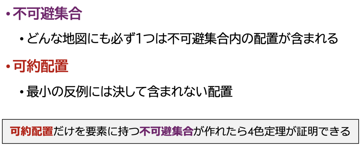 3つめと4つめのキーアイデアは、不可避集合 と 可約配置 を考えることなのですが、これらは素晴らしいアイデアです。